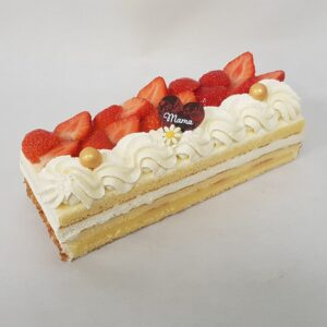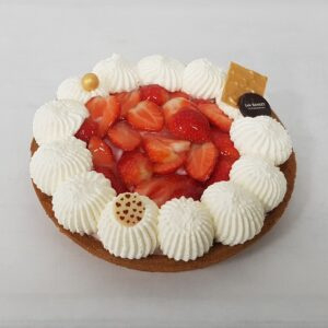 De taart heeft een wenerdeeg bodem. Een aardbeienvulling, met slagroom, meringue en verse aardbeien afgewerkt.